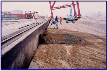リニューアル(災害復旧)岸壁 復旧後の六甲アイランド 兵庫県南部の地震で被災した六甲アイランド岸壁の復旧工事で事前混合処理工法が採用されました。 護岸背面を掘削し、処理後、埋め戻すことで、建設廃棄物の削減にも寄与しました。 キーワード:液状化防止、土圧低減、工期短縮、発生土の有効活用 被災状況 事前混合による岸壁復旧全景 機械練りミキサ船全景 施工断面図